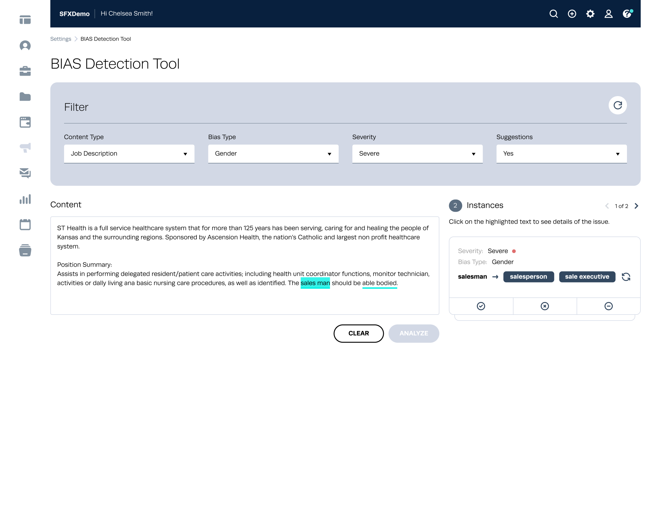 Suggestion Box: Provides alternatives to biased words (e.g., "salesman" to "salesperson" or "sales executive").