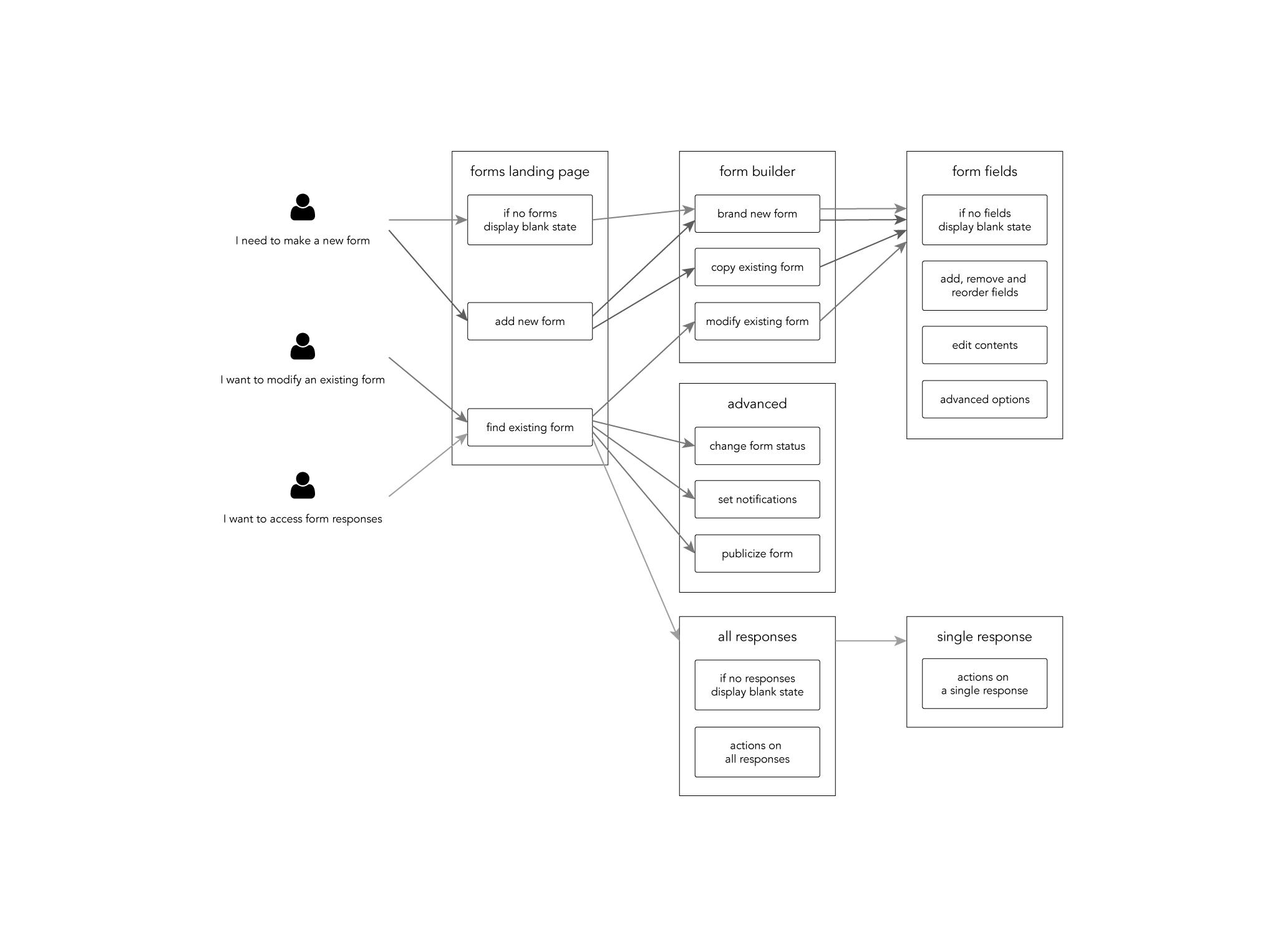 Based on interviews with clients and stakeholders as well as analysis of support tickets, the Product Manager created the project roadmap. From there I researched direct competitors and popular form builders with an eye toward ease of use, standard elements, error handling, response collection and advanced settings.