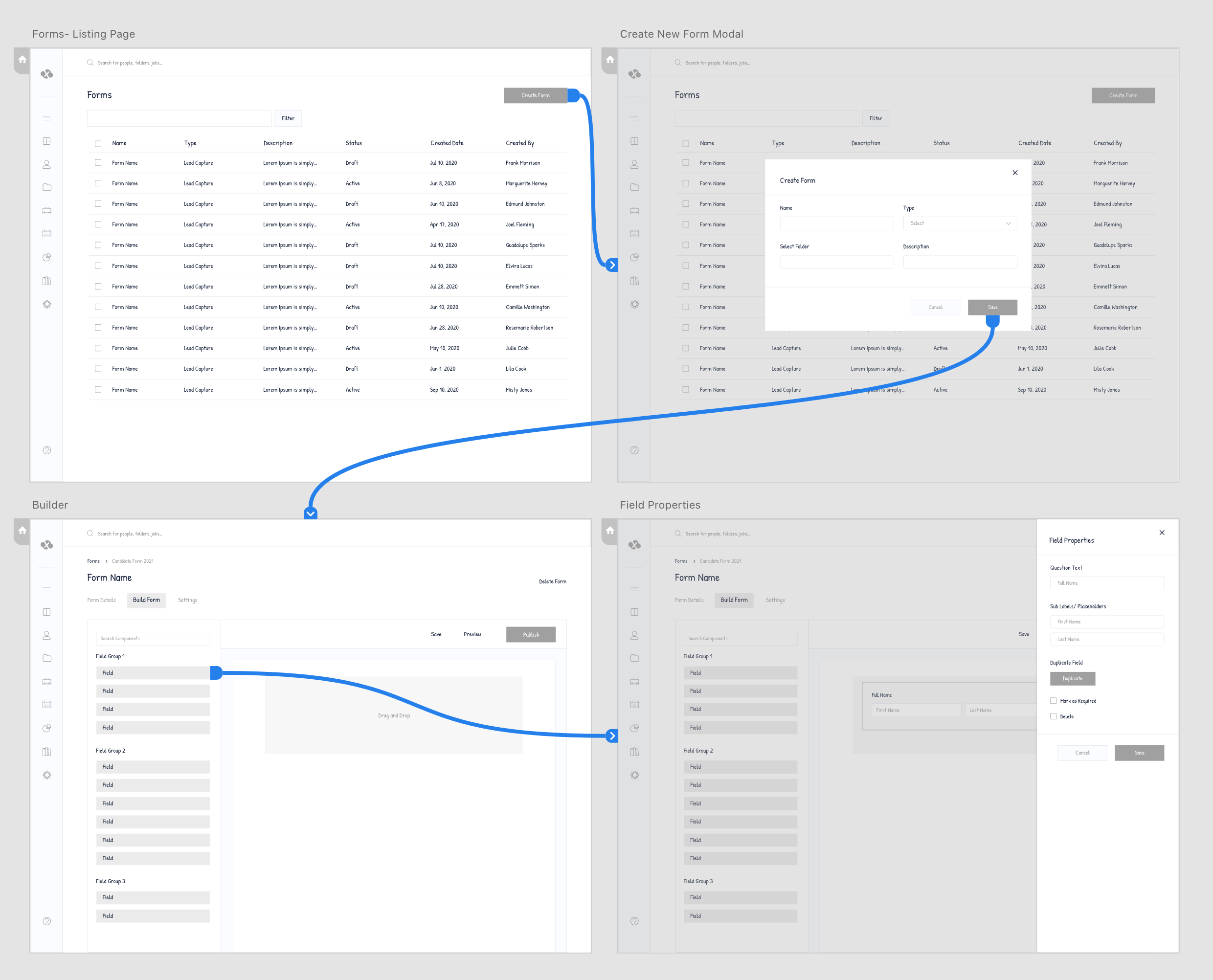 I found inspiration in Jotform’s dynamic sidebar feature and used a similar approach to keep the field bank/library and the form builder in view at all times.